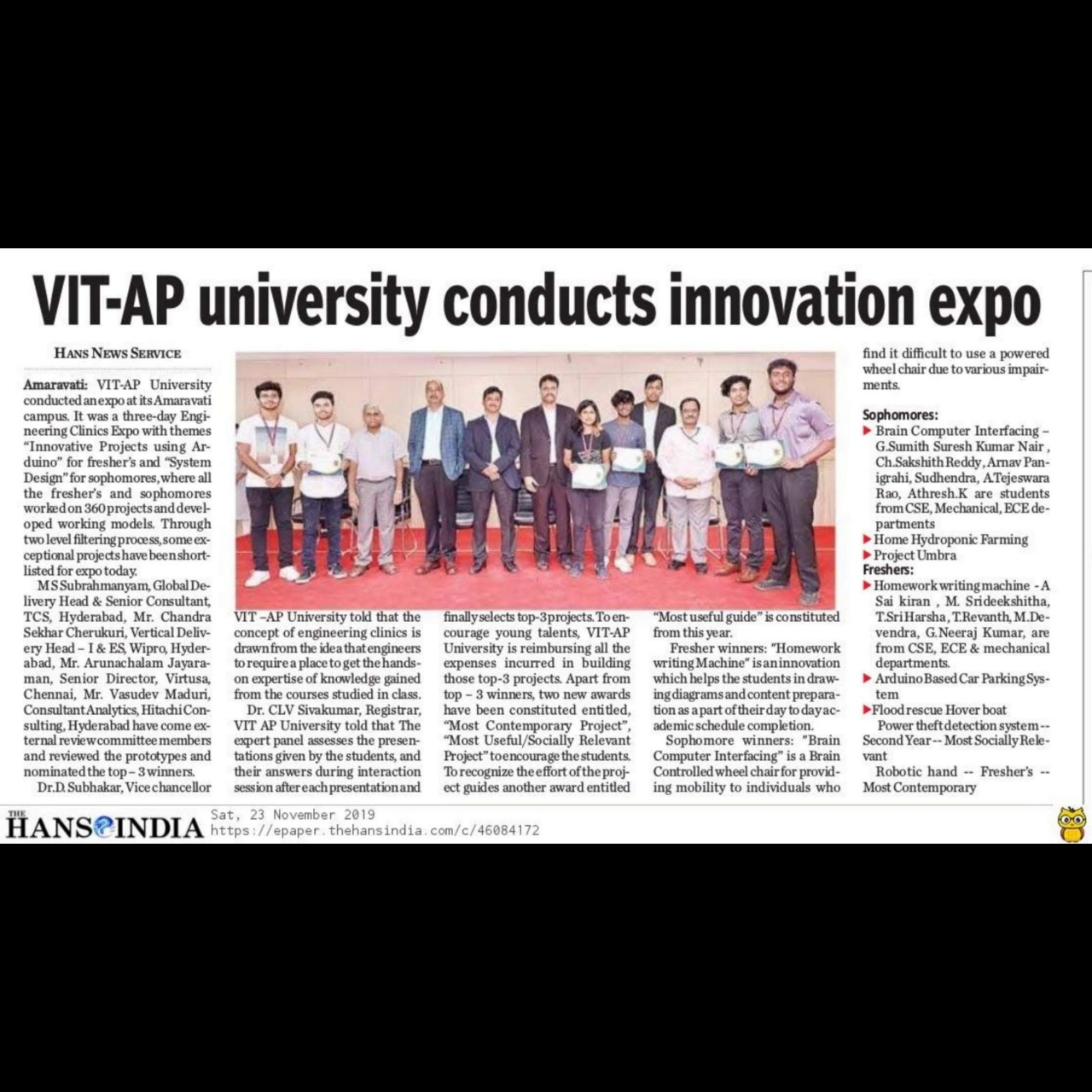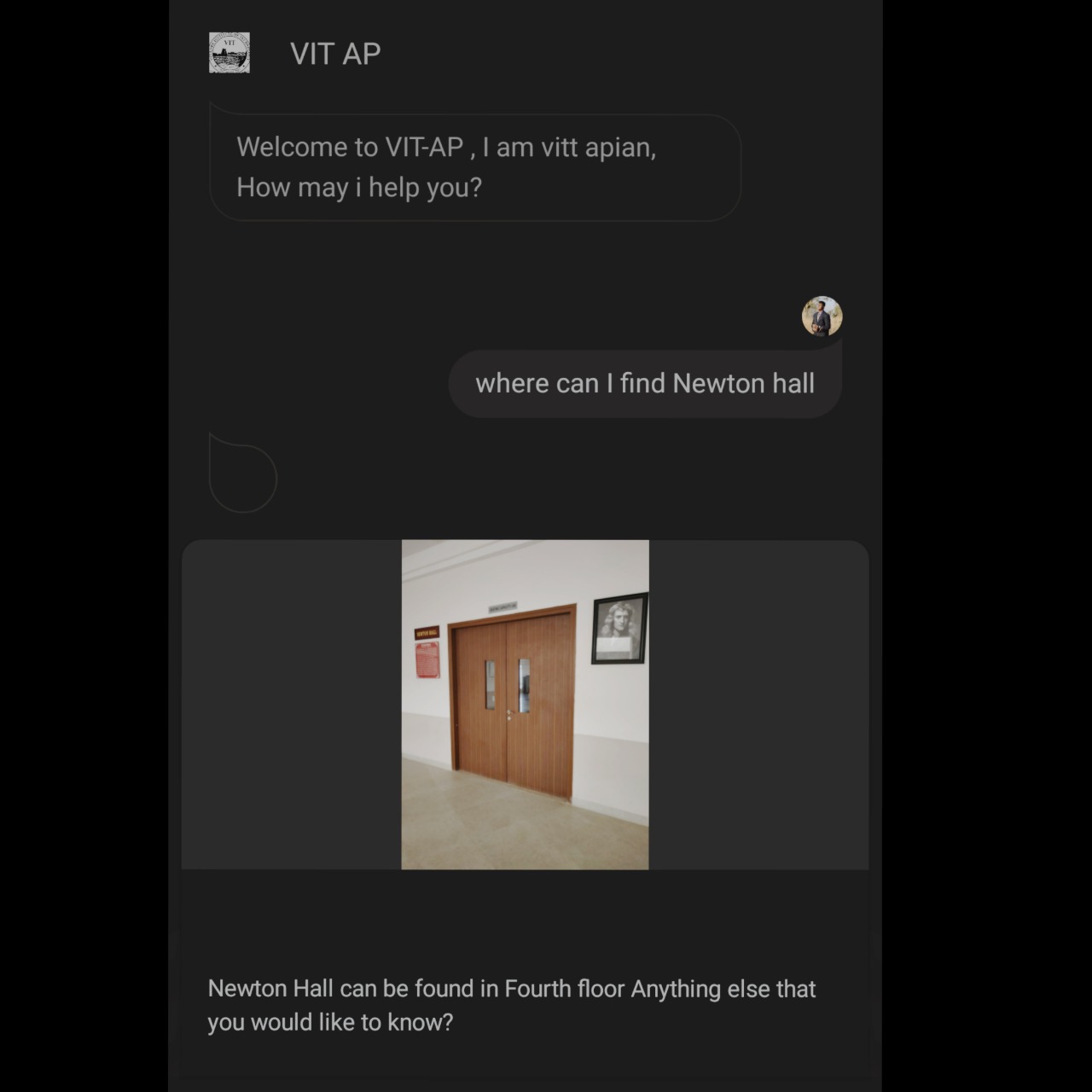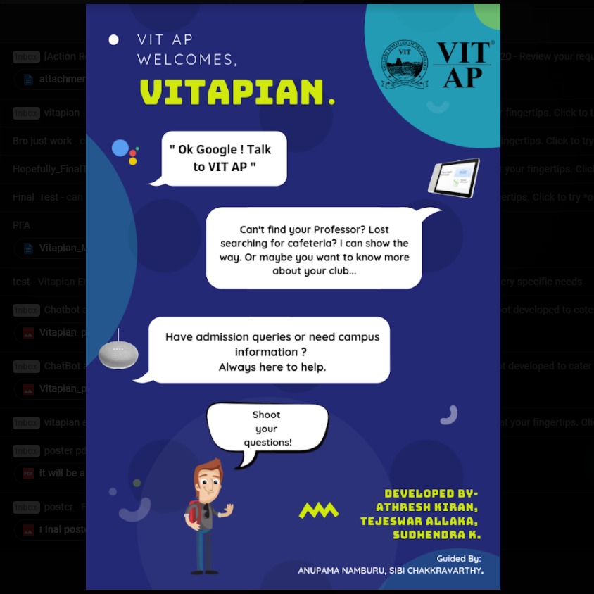 A chatbot developed using Actions on Google, that helps the students of VIT-AP to know about the teacher's cabin numbers along with the intercom details, details regarding the university, details of upcoming events and more. The bot uses Dialogflow with custsom built webhook API for implementation and Firebase as a database to fetch realtime data.